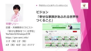 2021年3月3日 / 最終更新日時 : 2021年3月3日 kumikumi-cpj 今回のイベントについて 2月23日イベント座談会メンバーご紹介 平野リリーさん 平野リリーさん 恋愛・夫婦関係セラピスト「幸せな家族をつくる学校」 YouTube&Himalaya主宰 https://pre-sent.info/ 0才(男)2才(男)4才(男)10才(女)のママ コメントを残す コメントをキャンセルメールアドレスが公開されることはありません。 ※ が付いている欄は必須項目ですコメント ※ 名前 ※ メール ※ サイト 次回のコメントで使用するためブラウザーに自分の名前、メールアドレス、サイトを保存する。